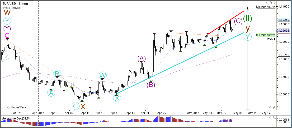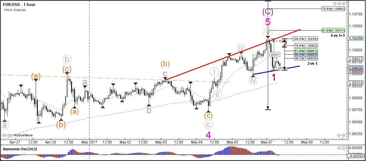 The EUR/USD could have completed the 5 th waves (grey/pink) and is potentially building a reversal wave 1-2 (brown). A break above the top and 100% Fib level at 1.1023 would indicate a potential uptrend continuation towards the Fibonacci targets of wave 5 (pink).