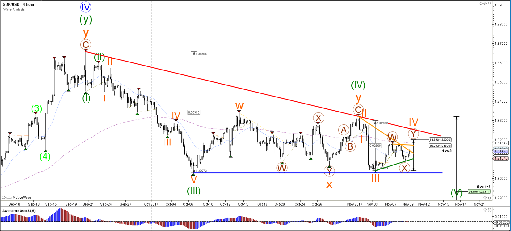 The GBP/USD break above the 61.8% Fib makes a wave 4 (orange) less likely. For the moment, the Cable is testing the Fibonacci levels of wave 4 (orange) which could act as resistance.