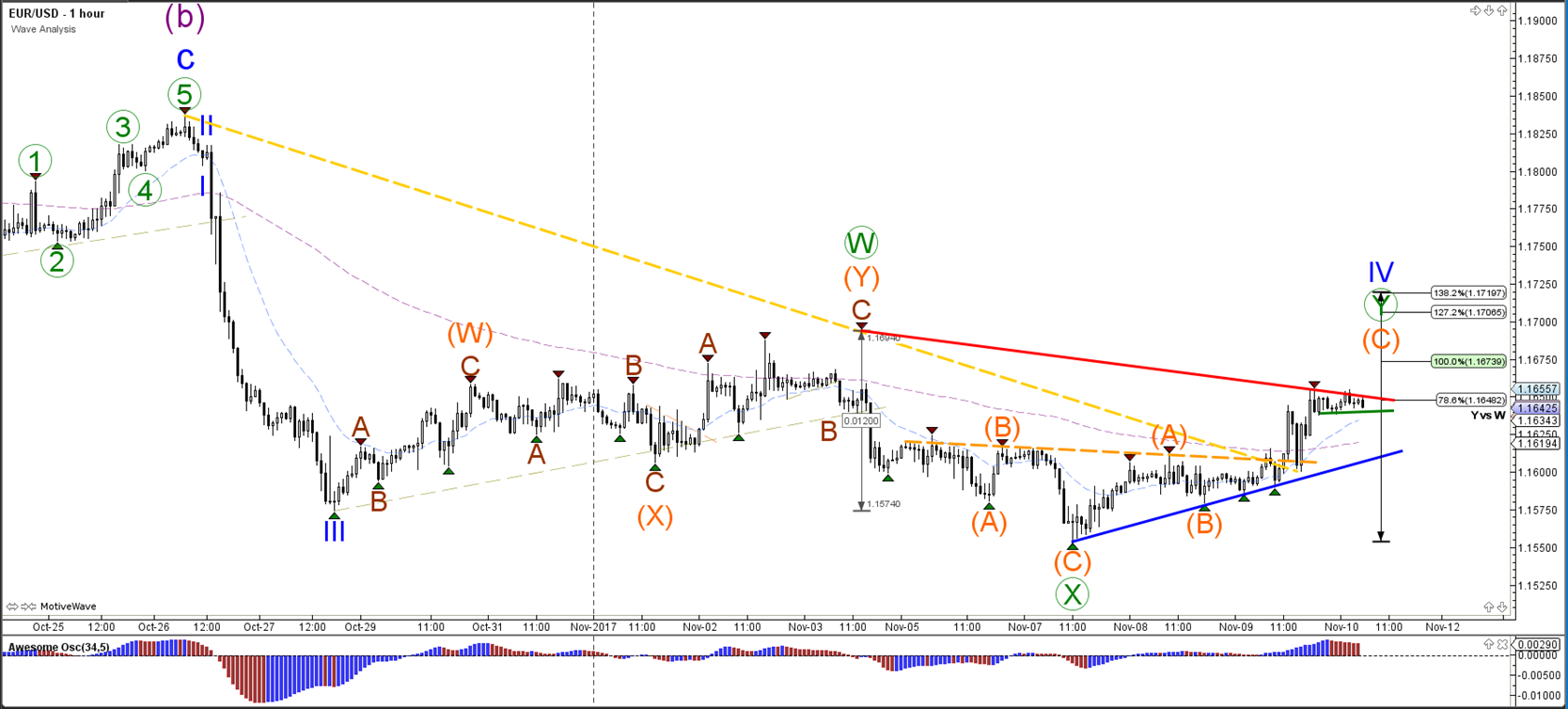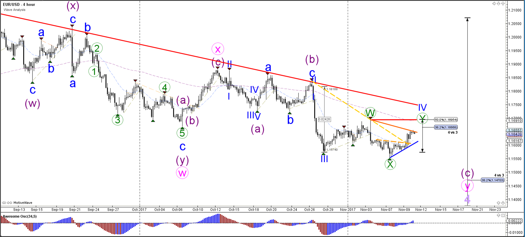 The EUR/USD seems to be building an ABC (orange) within a wave 4 (green) correction.