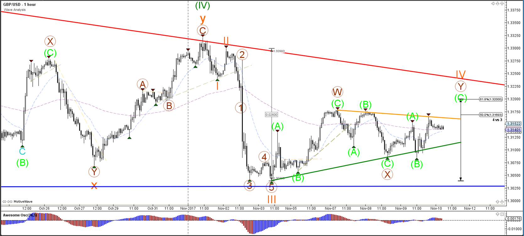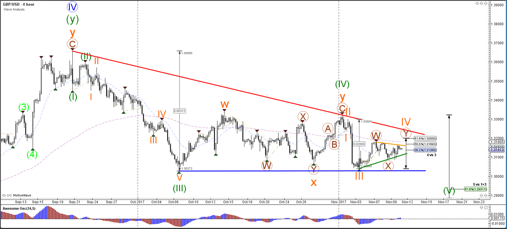 The GBP/USD is testing the Fibonacci levels of wave 4 (orange). A break above the 61.8% Fib makes a wave 4 (orange) less likely whereas a break below support could indicate a bearish breakout. Price is building a smaller triangle in a larger wedge pattern (red/blue lines).
